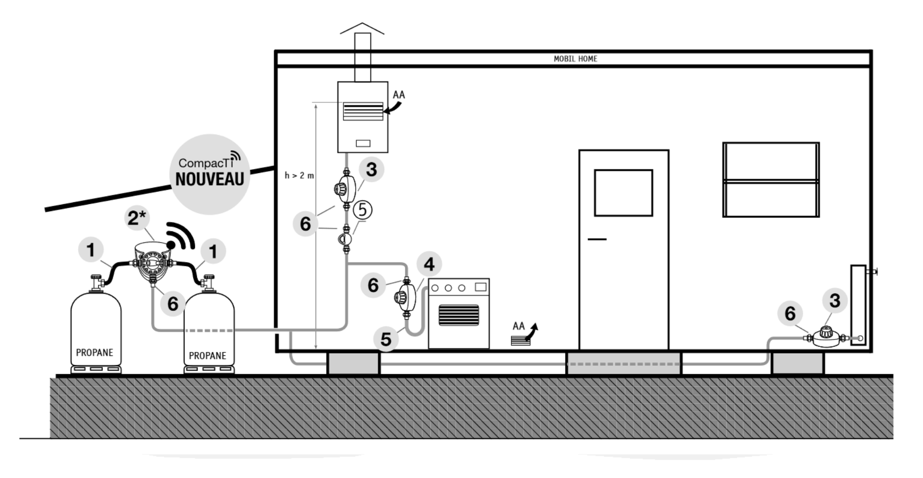 Exemple d’installation avec alimentation d’un mobilhome par 2 bouteilles avec un PROKIT PLUS S, un détendeur à sécurité T et un détendeur à sécurité